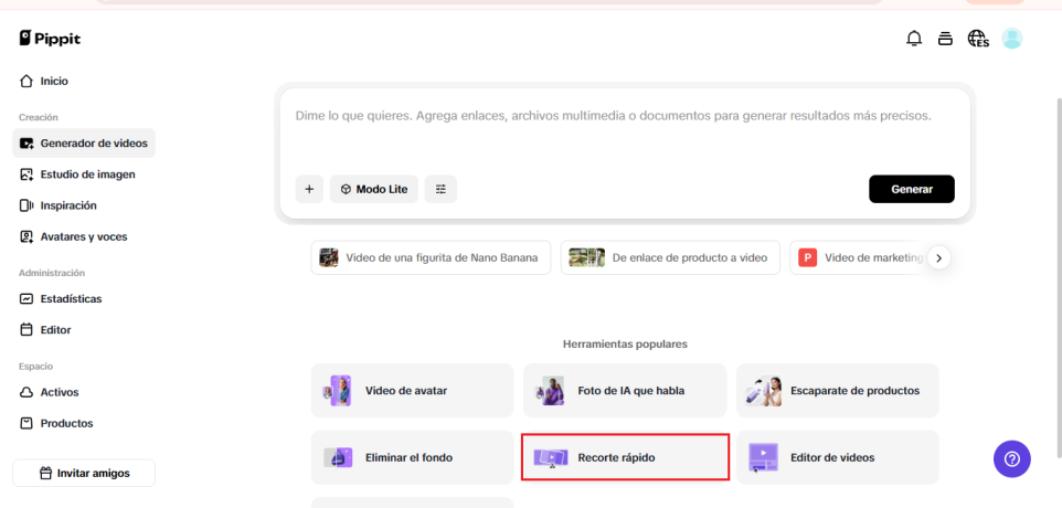 Inicia sesión en tu espacio de trabajo de Pippit y ve al generador de videos. Selecciona Recorte rápido en el menú para ingresar al estudio de edición. Aquí es donde comienza el viaje global de tu producto.
